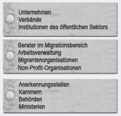 Zudem sollen neue Beratungsangebote dazu beitragen, die berufliche Integration von Migranten zu verbessern. Dies betrifft soziale Dienste wie die Arbeitsverwaltung und Wohlfahrtsverbände ebenso wie Bildungs-institutionen und Anerkennungsstellen. Auch sie stehen vor der Herausforderung, ihre Organisationsstrukturen weiter zu entwickeln.